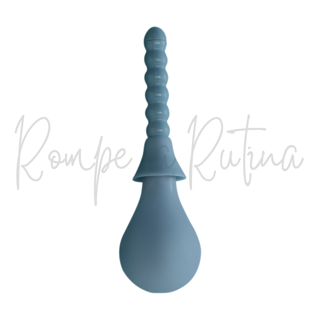 Para usar, comprima la pera y sumerja la boquilla en agua tibia, relajando lentamente la presión para que se llene. Inserte la boquilla de la pera en el accesorio estriado y aplique un lubricante de silicona, como Pure Pleasure, para facilitar la inserción. Una vez insertado, apriete suavemente la pera para rociar. Después de usar, separe todas las piezas y límpielas bien con agua tibia y jabón. Coloque la pera y el accesorio estriado boca abajo para que se sequen.